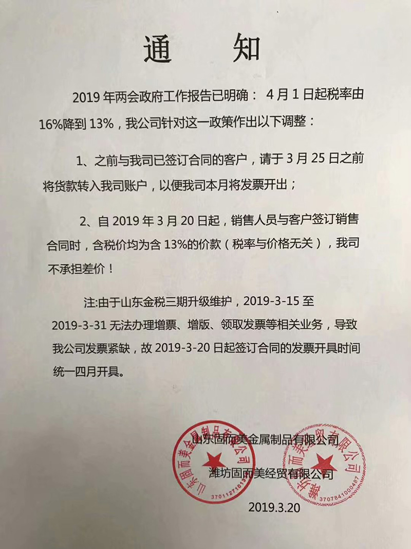 【重要通知】關(guān)于19年兩會(huì)提出的稅率調(diào)整情況,我司調(diào)整如下