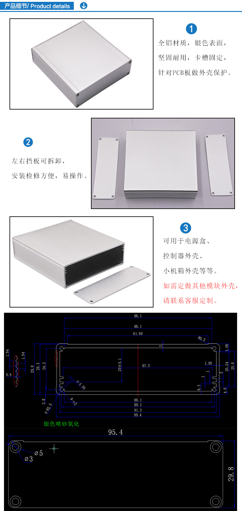 特點(diǎn):1.全鋁材質(zhì),銀色表面,堅固耐用,卡槽固定,針對PCB板做外殼保護(hù)。