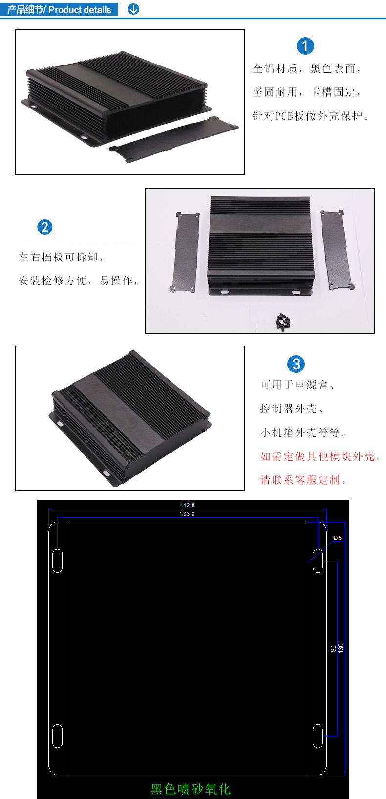 特點:1.全鋁材質(zhì),黑色表面,堅固耐用,卡槽固定,針對PCB板做外殼保護(hù)。